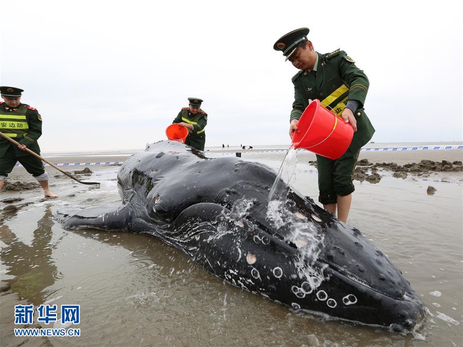 11月13日,邊防民警向擱淺的座頭鯨潑水以保持其體表濕潤(rùn)。