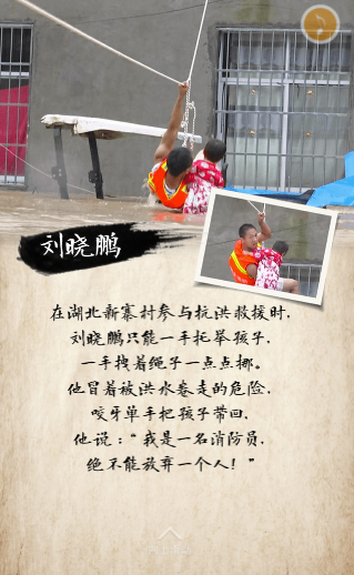 在湖北新寨村參與抗洪救援時(shí),劉曉鵬只能一手托舉孩子,一手拽著繩子一點(diǎn)點(diǎn)挪。他冒著被洪水卷走的危險(xiǎn),咬牙單手把孩子帶回 ,他說(shuō):“我是一名消防員,絕不能放棄一個(gè)人!”