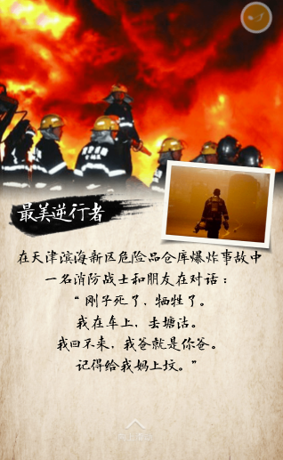 在天津?yàn)I海新區(qū)危險(xiǎn)品倉(cāng)庫(kù)爆炸事故中,一名消防戰(zhàn)士和朋友在對(duì)話(huà):“剛子死了,犧牲了。我在車(chē)上,去塘沽。我回不來(lái),我爸就是你爸。記得給我媽上墳?!?/p>