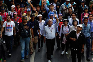 5月9日,泰國(guó)反政府示威者在素帖(中)的領(lǐng)導(dǎo)下在曼谷市中心游行。