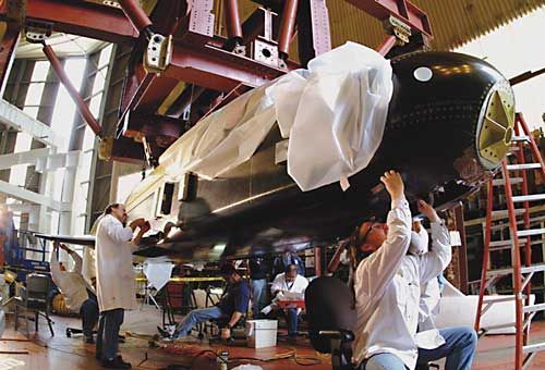 正在制造中的X-37B。X-37太空飛機,也簡稱為“X-37”,是美國國防部與宇航局共同制定的“FALCON”計劃、為實現(xiàn)“快速全球打擊”的構想而研制的一種空天飛機。這種空天飛機在兩小時內(nèi)可攻擊地球上任意一個目標。“X-37”太空飛機是“FALCON”項目中的第一個預研型號,是與微型航天飛機相似的飛行器。它將驗證NASA軌道太空飛機項目中25項創(chuàng)新的航天技術。