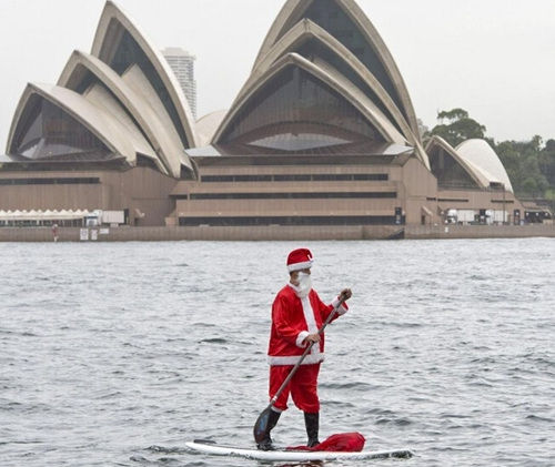 如今圣誕老人出門不單是靠雪橇了,在澳大利亞,這里高能的圣誕老人可以在劃槳板上表演水上漂來慶祝圣誕。據(jù)報道,澳大利亞當?shù)貢r間12月18日,在悉尼港圣誕老人劃槳經(jīng)過P&O郵輪公司的“太平洋寶石號”。由于當?shù)赜洼喒I(yè)迅速增長,將有6000名澳大利亞人登上P&O郵輪公司的油輪和圣誕老人一起慶祝圣誕節(jié)來臨。