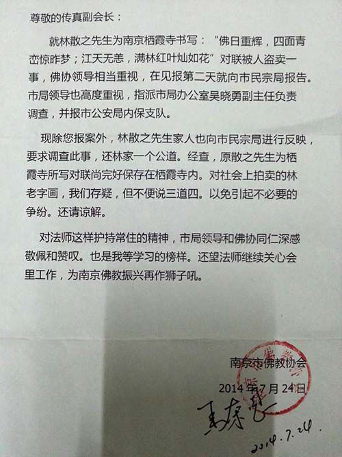7月24日,傳真法師收到一封南京市佛教協(xié)會(huì)的回函?;睾Q,除了傳真法師報(bào)案外,林散之家人也向市民宗局反映,要求調(diào)查此事,還林家一個(gè)公道。