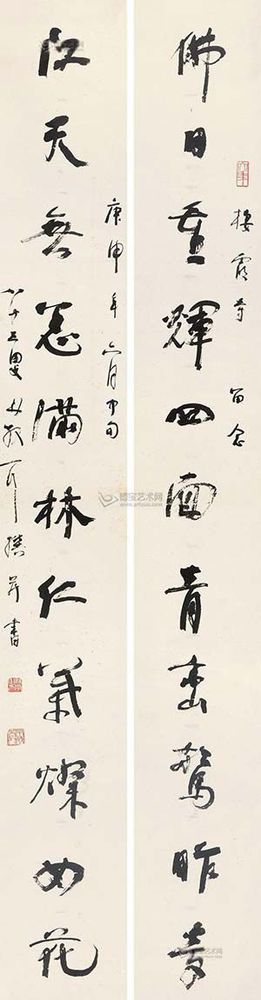 北京匡時(shí)國(guó)際拍賣有限公司描述稱,林散之先生的這副作品作于1980年,為棲霞寺所書,林氏時(shí)年83歲,已是人書俱老的時(shí)期……林散之筆下的線條曲中有直,直中寓曲,剛中有柔,柔中寓剛,從而達(dá)到一種清逸虛妙之境。林散之的草書風(fēng)格雖然欹正相生,但往往會(huì)把其中的變化復(fù)歸平正,偏能得中,奇而能穩(wěn),故顯得格外的老成與持重。由于林散之的藝術(shù)思想受佛家影響較深,而此為“三論宗”的發(fā)源地棲霞寺所書,更能見其書寫之虔誠(chéng)。