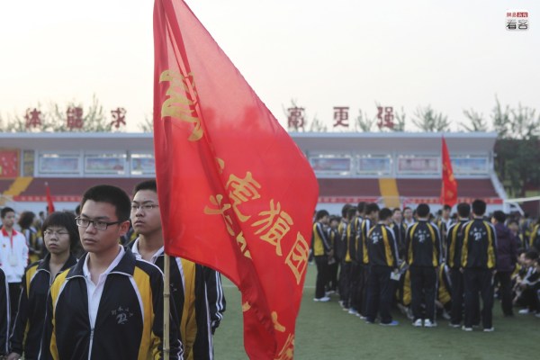 這樣的誓師大會(huì)每年都會(huì)舉行,而類似于誓師的各種勵(lì)志行動(dòng)在這里都相當(dāng)常見。圖為2012年5月1日,衡水二中操場上,一名學(xué)生舉著寫有“虎狼團(tuán)”字樣的旗幟參加跑操。