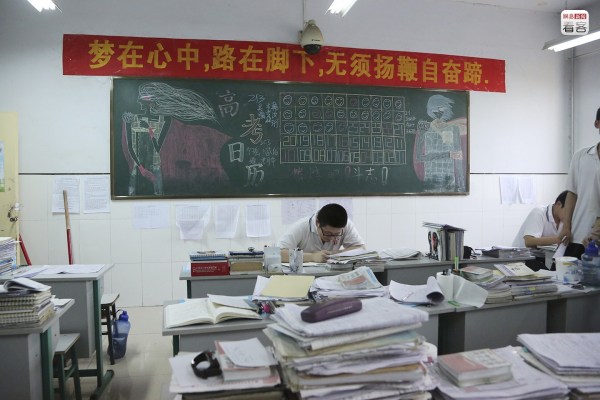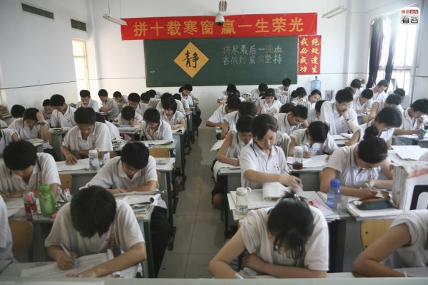 很難說在這種狂熱的氣氛下,學(xué)生們是不是真的能靜下心來。與狂熱氣氛相對的,是“冷”、“靜”這樣的詞匯的常見,不少教室也貼著“冷靜”的提示。圖為2012年6月2日,學(xué)生們準(zhǔn)備高考。