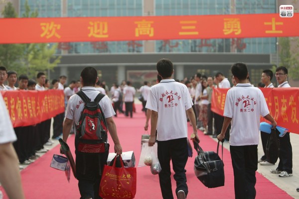 圖為2013年5月24日,衡水二中高三學(xué)生經(jīng)過短暫的休息返校,這次返校后他們下一次休息將是高考結(jié)束。歸校時(shí),他們被譽(yù)為“勇士”,所有高三班主任則站在門口兩側(cè)迎接學(xué)生歸來。