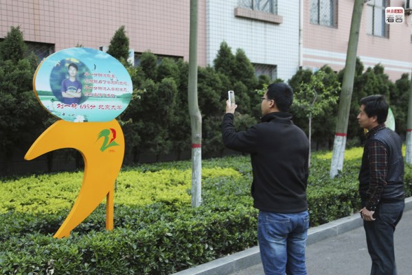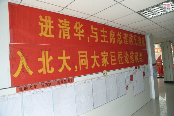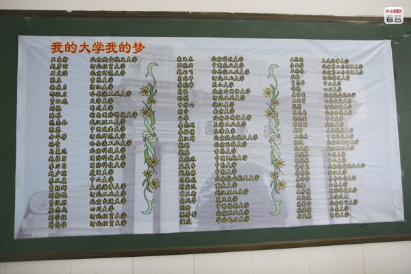 每當(dāng)空閑的時(shí)候,她便望向路對面校門口的展板上那張考上清華、北大學(xué)生與校長的大合影。她希望明年在這里也能看到女兒的身影。
