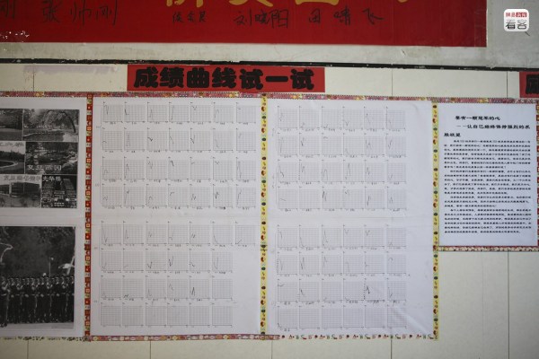 圖為2013年5月10日,學(xué)校走廊上貼著的“成績曲線”,將每個(gè)學(xué)生歷次考試成績以曲線的方式展現(xiàn)。而這樣類似的成績表、成績單布滿了走廊的每一面墻。