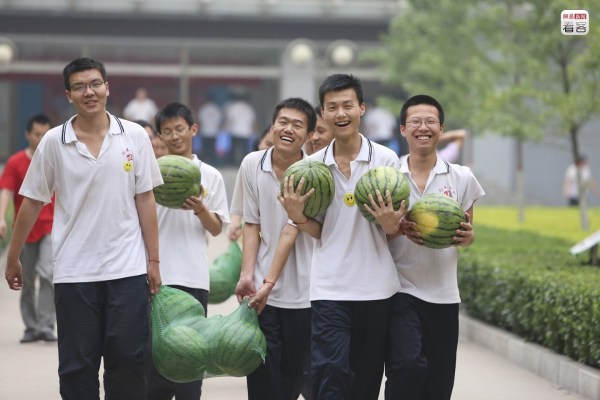 圖為2012年6月6日,學(xué)生們抱著學(xué)校發(fā)的西瓜,臨近高考,這種免費(fèi)福利不少。而高考前一天晚上的晚自習(xí),老師則會(huì)帶著學(xué)生們舉行一場“西瓜宴”