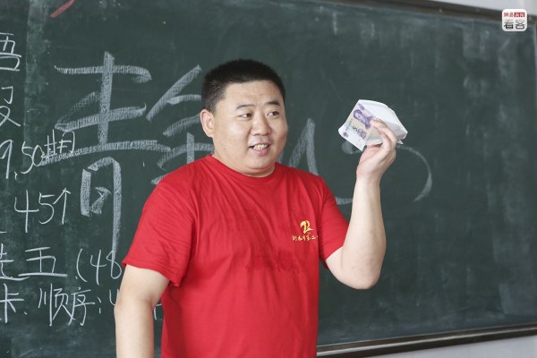 學(xué)校的另一項(xiàng)解壓措施是發(fā)放“回頭錢”,向每名學(xué)生發(fā)兩張五元紙幣,寓意“五谷豐登”、“十全十美”。圖為2012年6月3日,一位老師拿著一沓新紙幣準(zhǔn)備發(fā)給學(xué)生。