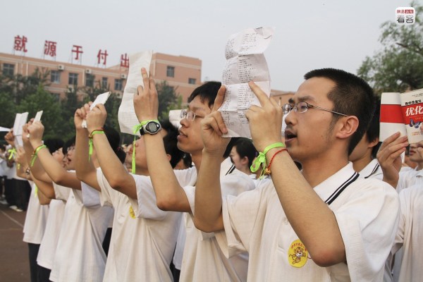 高考進(jìn)行前,學(xué)校還會(huì)帶領(lǐng)學(xué)生進(jìn)行最后一輪鼓勁,老師們穿著紅色T恤,背后寫著“和你在一起”,學(xué)生們則集體穿著白色T恤,在老師的帶領(lǐng)下喊口號(hào)。圖為2011年6月8日,學(xué)生們即將參加高考。