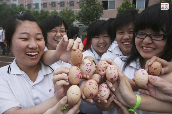 吃“幸運(yùn)蛋”、過“成功門”也是學(xué)校每到高考前夕都會(huì)準(zhǔn)備的活動(dòng)。圖為2009年6月7日,學(xué)生們拿著畫著笑臉的雞蛋。