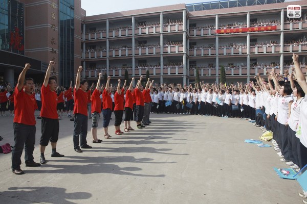 河北衡水二中,因?yàn)橐欢蚊麨椤逗馑?013高考百日誓師》而走紅。該校在臨近高考100天時(shí)全校集中在操場宣誓,場面震撼,引發(fā)熱議。宣誓中,領(lǐng)講人帶著全校學(xué)生喊“一三高考,誰與爭鋒。英雄少年,唯我二中”、“決戰(zhàn)百天,我必成功!我必成功!我必成功!我必成功!”圖為2013年2月26日,學(xué)生們參加高考百日誓師大會(huì)。