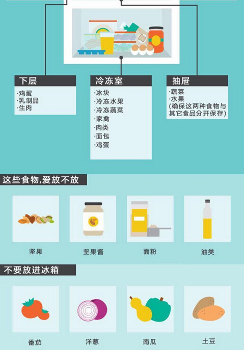 首先你應該清楚,即便你的冰箱足夠冷,但是冰箱中各個部分的溫度,仍舊會因為它們與制冷裝置距離的不同而不同。根據(jù)下面這張圖來放置食物,它們的保鮮時間將會更長。