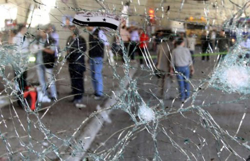 4月27日敘利亞首都大馬士革爆炸現(xiàn)場,一輛中巴窗戶玻璃被震碎