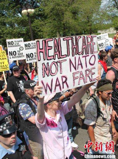 北約峰會(huì)5月20日在芝加哥開(kāi)幕,萬(wàn)余名示威者掀起規(guī)??涨暗挠涡锌棺h活動(dòng)。圖為當(dāng)天游行中的一個(gè)場(chǎng)景,右側(cè)為正在執(zhí)勤的警察,中為一名美女示威者,左側(cè)為一名參加過(guò)阿富汗戰(zhàn)爭(zhēng)的美國(guó)退伍軍人。中新社發(fā)李洋攝