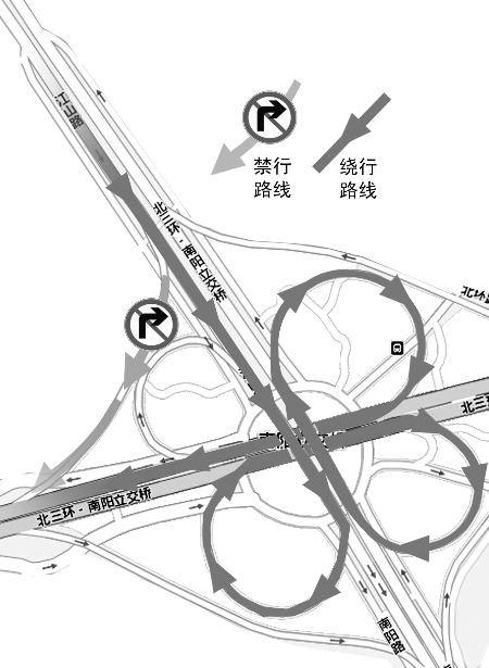 鄭州交巡警支隊(duì)有關(guān)負(fù)責(zé)人建議司機(jī)在北環(huán)立交橋上通過連續(xù)轉(zhuǎn)彎實(shí)施右轉(zhuǎn)(可參照圖示),具體如下: