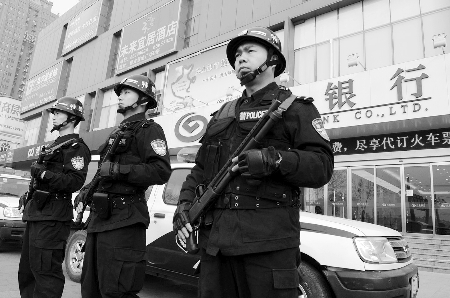 鄭州市公安局特警支隊(duì)長李文正說,武裝特警按要求將于每小時不少于5~10分鐘在銀行門前跨立,并在附近巡區(qū)開展巡邏。一名到銀行取錢的市民說,看到全副武裝的特警在這里守護(hù),心里很踏實(shí)。