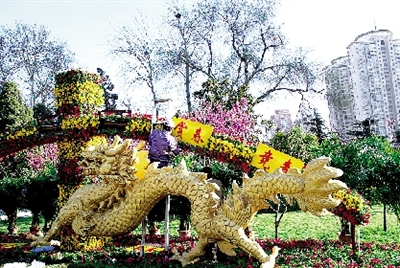 此次花展分別布置了“雙龍競春”、“綠島探春”等5個立體和平面花壇,有配花如牽牛花、三色堇等兩萬余盆,另有袖珍葉子、散尾葵、綠茉莉、夏威夷等近千盆點(diǎn)綴,其中景點(diǎn)“樂童嬉春”的“魔方”使用7000余枝鮮切花康乃馨制成。