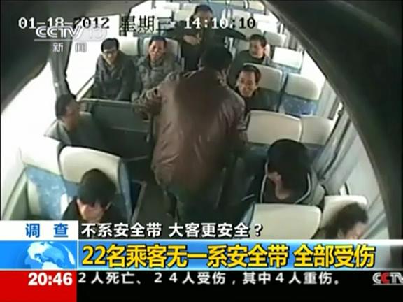 一段浙江交警提供的畫(huà)面顯示,在一輛大客車(chē)上,由于乘客未系安全帶,在車(chē)禍發(fā)生瞬間,全部被撞飛,造成1死21傷。