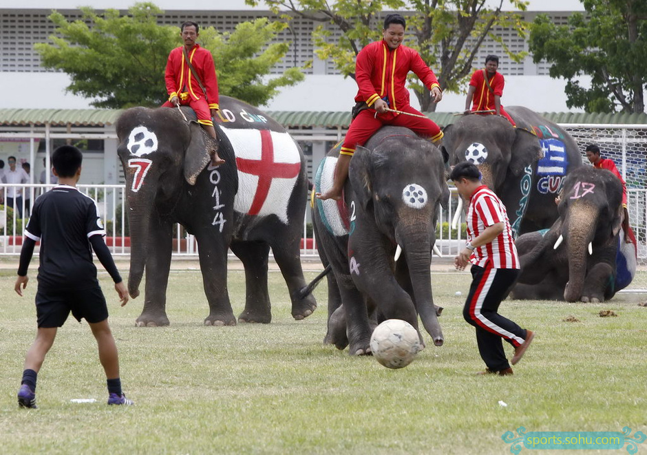 學(xué)生們與身上畫有世界杯參賽球隊(duì)國(guó)旗圖案的大象踢足球