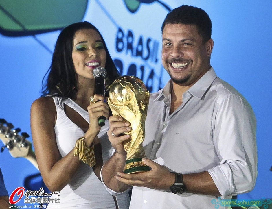 2014年世界球迷盛會上羅納爾多展示大力神杯,他曾在1994年和2002年兩度帶領(lǐng)巴西隊獲得大力神杯。圖為羅納爾多展示大力神杯。