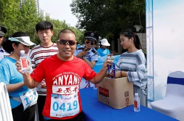 跑完全程的跑者井然有序地領(lǐng)取小酒