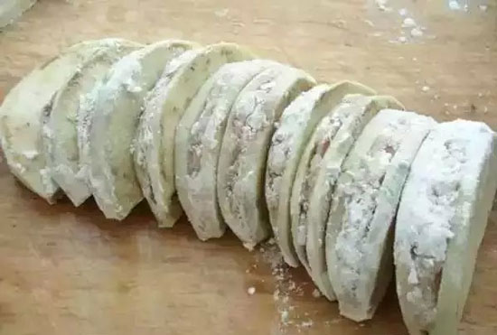 3. 茄子去皮切成連刀片,要切的薄一點(diǎn),便于成熟,抹少許面粉。