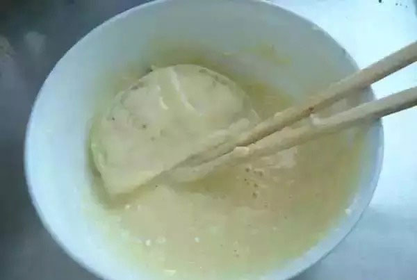 7. 面粉里放入雞蛋,鹽,不要加水,拌勻。茄團(tuán)掛糊。