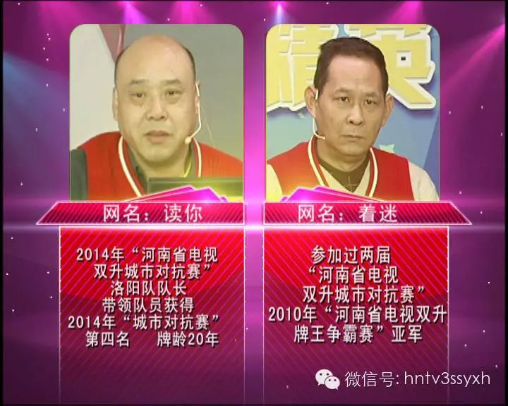 今晚將要比拼的是精英賽下半?yún)^(qū)第1輪的第4場比賽,說到選手陣容,可以說是實(shí)至名歸的精英牌手。“讀你”和“著迷”都來自洛陽,“讀你”牌齡更是長達(dá)20年,在2014年城市對抗賽任洛陽隊(duì)隊(duì)長,并帶領(lǐng)隊(duì)員獲得2014年城市對抗賽第四名的好成績?!爸浴痹@得2010年河南省電視雙升牌王爭霸賽亞軍,曾參加過兩屆城市對抗賽,也是洛陽隊(duì)的老隊(duì)員,實(shí)力雄厚。