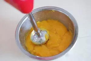 6、將芒果內(nèi)倒入3中冷卻的液體中,用打蛋器攪打均勻。