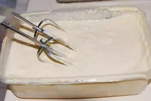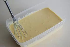 8、等冰淇淋剛開始結(jié)冰時(shí)取出容器,用打蛋器攪打一會兒,之后每隔30分鐘取出攪打一次,共打4次以上即可。
