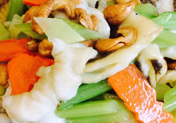5、鍋置于火上,少量油燒熱,倒入姜片和胡蘿卜片,然后倒入焯過水的芹菜,翻炒片刻倒入魚肉,然后加入鹽,味精,香油,淀粉,一點清水,翻炒片刻,最后加入腰果翻炒均勻即可,最后在魚骨上撒上椒鹽就可以了。
