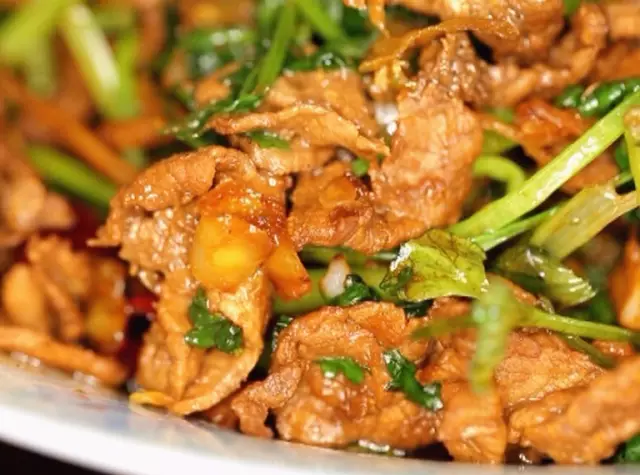 薄薄的牛肉片和香菜經(jīng)過簡單爆炒