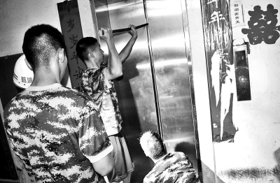 漯河消防官兵試圖打開電梯門,救出被困的人。