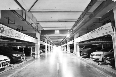 該停車場(chǎng)負(fù)一層是機(jī)械車庫,停得滿滿當(dāng)當(dāng);負(fù)二層也是機(jī)械車庫,但還有空位。