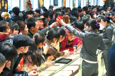 昨天,市民在菜百挑選黃金飾品。當(dāng)天是新年第一天,北京各大金店出現(xiàn)消費(fèi)者囤金迎新的火爆場景。其中,菜百各分店全天銷售額達(dá)到兩億元;中國黃金蔣宅口旗艦店投資金銷售超過150公斤。京華時報(bào)記者蒲東峰攝