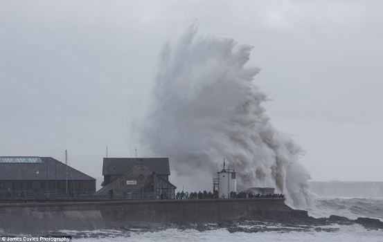 英國數(shù)十民眾聚集海邊大膽觀看驚濤巨浪的場面